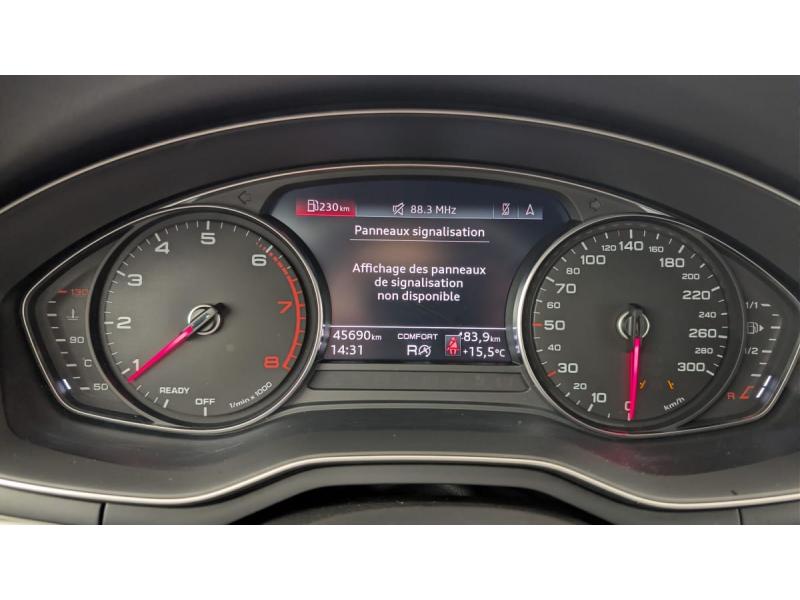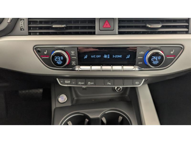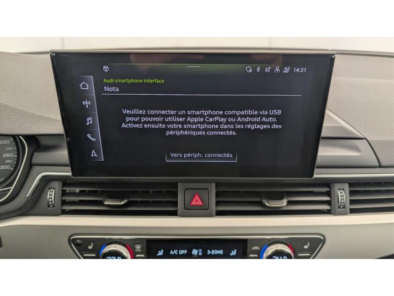 Accoudoir central confort AV avec inclinaison réglable et coulissant en longueurAirbags grand volume conducteur et passager AVAirbags latéraux à l'AV et système d'airbags de têteApplications décoratives argent flex métalliqueAppui lombaire à 4 axes pour les sièges AV: réglages électrique, horizontal et verticalAudi Drive SelectAudi Parking System PlusAudi Pre Sense cityAudi smartphone interface (Apple CarPlay ou Google Android Auto)Climatisation automatique confort 3 zonesCoffre à ouverture et fermeture électriquesCommande de désactivation de l'airbag passager AVDétecteur de pluie et de luminositéDirection assistée électromécaniqueFeux AR à LEDFinition extérieure Design : Extentions de bas de caisse couleur carrosserie Calandre en noir titane laqué avec lamelles en argent aluminium mat Grilles d’entrée d’air latérales en noir mat grainé avec insert en argent aluminium mat Diffuseur AR en noiFixation pour sièges enfants ISOFIX et Top Tether pour les places AR extérieuresFrein de stationnement électromécaniqueInterface BluetoothKeyless Go: démarrage et arrêt du moteur par touche moteur Start/Stop sur la console centraleLimitation de la vitesse maximale à 210 km/hMMI Radio PlusMoulures de seuil avec insert en aluminium dans les ouvertures des portières AVPhares AV à LED (feux de croisement, feux de route, feux diurnes et feux de position LED, clignotants à ampoule, avec éclairage tout-temps)Plancher de chargement réversibleRéception radio numérique (DAB)Rétroviseur intérieur sans encadrement jour/nuit automatiqueRétroviseurs extérieurs avec feux clignotants à LED intégrés et dans la teinte du véhiculeRétroviseurs extérieurs réglables et escamotables électriquement, jour/nuit automatique, dégivrants des deux côtés et buses de lave-glaces dégivrantesS tronic, boîte séquentielle 7 vitesses à double embrayage avec commande électrohydrauliqueSystème d'information du conducteur avec écran couleur haute résolution de 7"Système Start & StopTire Mobility System Compresseur et produit de colmatage en cas de crevaison