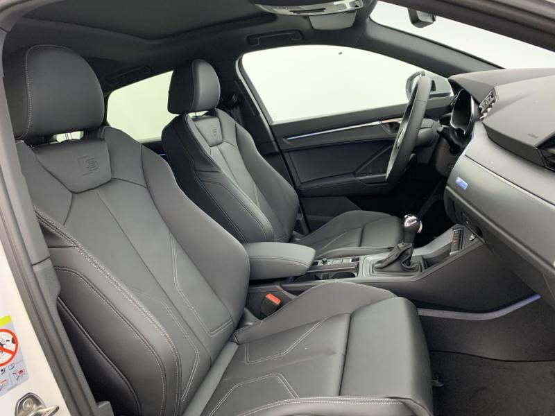 Accoudoir central coulissant en longueur, avec inclinaison réglable et vide-poches relevableAccoudoirs des contre-portes en matériaux synthétiques monopur 550Affichage de contrôle de pression des pneusAppel d'urgence Audi connectApplications décoratives en aluminium mat Brossé FoncéAssise et dossier de banquette AR, divisée, rabattable 40/20/40Audi Connect NavigationAudi Connect sécuritéAudi Drive SelectAudi Hold AssistAudi Parking System PlusAudi Pre Sense Basic Déploie automatiquement, lorsque nécessaire, des mesures préventives pour votre sécurité et celle de vos passagers, parmi lesquelles: Resserrement des ceintures de sécurité à l'avant afin de limiter tout déplacAudi Smartphone InterfaceAvertisseur de franchissement de ligne et avertisseur de changement de voieBanquette AR avec porte-gobelet dans l'accoudoir de la place centraleBoîtiers de rétroviseurs extérieurs couleur carrosserieCaméra de reculCiel de pavillon en tissu NoirClé confort incluant déverrouillage du coffre par capteur (sans Safelock)Climatisation automatique confort 2 zonesDétecteur de pluie et de luminositéDétection de signalisation routière par caméraDirection progressiveFixation pour sièges enfants ISOFIX et Top Tether pour les sièges extérieurs ARHayon de coffre à ouverture et fermeture électriqueInterface BluetoothPack Aluminium IntérieurPack S Line Extérieur : Diffuseur en Noir Titane mat Lamelles en Argent Aluminium mat Encadrement des prises d'air latérales AV en Gris Platine mat Becquet AV en peinture intégrale (couleur de la carrosserie) avec lame Gris Platine mat Grille de diffuseur Noir mat grenue CPack S Line Intérieur : Pédalier et repose-pieds en acier inoxydable Sièges AV sport Frein à main avec surpiqûres contrastées, couleur assortie à celle de l'habitacle Estampillage S line sur le dossier des sièges AV Tapis noirs AV/AR avec Pare-brise en verre acoustique avec verre feuilleté athermiquePhares à LED avec clignotants dynamiques ARRéception radio numérique (DAB)Rétroviseur intérieur jour/nuit automatique sans encadrementRétroviseurs extérieurs réglables, dégivrants et rabattables électriquement avec fonction rabat automatiqueSièges AV réglables manuellement Hauteur et positionnement en longueur, Inclinaison de dossier, Hauteur des appuie-tête et des ceinturesSièges AV sportSuspensions SportVolant cuir multifonctions Plus 3 branches
