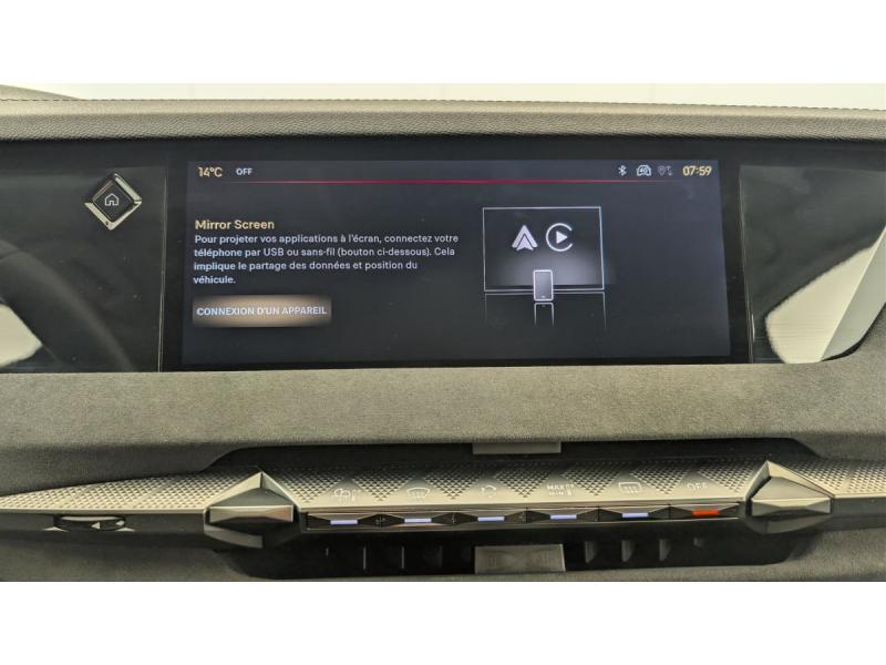 ABS avec répartiteur électronique de freinage (REF) et Aide au Freinage d'Urgence (AFU) Avec aide au démarrage en penteAccès et Démarrage mains libres Proximity Déverrouillage et déploiement automatique des poignées de portes affleurantes à l'approche du véhiculeAccoudoir central AR avec trappe à ski et 2 porte-gobeletsAccoudoir central AV Avec grand rangement réfrigéré et éclairéAide au stationnement AV et AR et Caméra de reculAirbags frontaux (passager déconnectable), latéraux AV, rideaux aux places AV/AR et central entre les places AVAlerte attention conducteurAlerte de franchissement involontaire de ligne Désactivable via l'écran tactileAllumage automatique des feuxAnneaux d'arrimage dans le coffre (x4)Antenne "aileron de requin" Antenne noir brillantAvertisseur de risque de collisionBanquette AR 2/3 - 1/3 avec 3 appuie-têteBanquette AR avec trappe à skisBoîte à gants floquéeCabochons d'écrous de roue noir brillantCapot actifCentre de roues NoirClean Cabin avec Air Quality SystemClimatisation automatique bizone 3 modes de diffusion Soft / Normal / Fast. Mode Monozone. Fonction Quick Launch via bouton dédié : froid ou chaud rapide selon la température extérieure. Aérateurs aux places ARCombiné numérique 7"Condamnation automatique des portes et du coffre en roulantConsole centrale avec rangement fermé Avec dépose-téléphone et 2 porte-gobeletsContrôle dynamique de stabilité (ESP) avec antipatinage des roues (ASR) + Contrôle de stabilité de l'attelageCoques de rétroviseurs extérieurs noir brillantDétection de sous-gonflageDiffuseur AR noir brillantDS AIR (Aérateurs centraux invisibles avec sabre chrome)DS e-toggle (Sélecteur de vitesses)DS EXTENDED HEAD UP DISPLAY Affichage tete haute étenduDS IRIS SYSTEM Navigation connectée, intégrant un assistant personnel et reconnaissance vocale, avec ChatGPT. Information trafic en temps réel, prix des carburants, parkings et Zones de Danger. 3 ans de services connectés inclusDS MATRIX LED VISION Intègre les technologies Matrix Beam et l'éclairage dynamique en courbe. Grâce aux cinq modes préétablis (ville, campagne, autoroute, météo difficile et brouillard), roulez en pleins phares sans éblouir les autres automDS SMART TOUCHDS Wings noir brillantEclairage d'ambiance à LED Personnalisable avec 8 couleurs sur les panneaux de portes AV, la planche de bord et le repose paumeEclairage de boîte à gants, d'accoudoir central AV et de coffre à LEDEclairage de cave à pieds à LEDEcran tactile capacitif 10" HDEnjoliveurs de bas de porte noirs avec insert chroméEnjoliveurs supérieurs des vitres latérales chromésEssuie-vitre AREssuie-vitre AV à déclenchement et cadencement automatiques + Buses de lavageFeux AR Full LED effet 3D avec traitement écaillesFixations ISOFIX aux places latérales AR Inclut un point d'ancrage TOP TETHERFrein de stationnement électrique automatiqueFreinage d'urgence automatique piloté par caméra et radarFreinage multi-collisionGrille de calandre noir brillant avec pampilles chroméesIntérieur Alcantara Noir : Planche de bord en Alcantara Ciel de pavillon clair Sellerie en Tissu Tressé Basalte avec Alcantara et toile DS Décors de panneaux de porte Chrome guilloché Volant cuir Fleur Mistral Console en toile DS Noir Basalte Panneaux de porte en AlcantaJantes alliage 19" SEVILLAJonc de volet chroméKit de dépannage provisoire de pneumatiquesLécheurs de vitres latérales et enjoliveur de custode noir brillantLève-vitres AV et AR électriques, séquentiels et antipincementLimiteur / Régulateur de vitesseLunette AR chauffanteMirror Screen sans fil via Wifi Compatible Apple CarPlay et Android AutoMonogramme DS chromé sur l'enjoliveur de custode latéralMonogramme extérieur ÉTOILE sur le capotMonogrammes AV/AR chromésPédalier en aluminiumPack sièges électriques Le réglage lombaires pneumatique. Le siège conducteur électrique à 10 voies avec mémoire de position, nez de coussin réglable mécaniquement et fonction accueil. Le siège passager électrique à Palettes au volantPare-brise teinté acoustiquePare-soleil avec miroirs de courtoisie occultables éclairés à LEDPlafonnier I-Dome tactile Liseuses iDome à commandes tactiles à l'ARPoignées extérieures affleurantes chroméesPréconditionnement thermique de l'habitacle programmable par smartphone Via MyDS AppPrédisposition pour roue de secours galettePrises 12 V 1 prise AV et 1 prise dans le coffrePrises USB 1 prise USB-C sous l'accoudoir central AV, 1 prise USB-C dans la console et 2 prises USB-C pour les passagers ARRégulateur de vitesse adaptatif et Pack Détection trafic AR Avec l'Adaptive Cruise Control Stop & Go. Le Pack Détection Trafic AR comprend l'Alerte de Trafic AR ainsi que la Surveillance d'Angle Mort Longue Distance : Adaptive Cruise Control Stop & Go SurRétroviseur intérieur électrochrome sans cadreRétroviseurs extérieurs électriques, dégivrants, rabattables électriquement Avec éclairage d'accueilRadio numérique terrestre (DAB)Reconnaissance étendue des panneaux de circulationSécurité Enfants Sécurité mécaniqueSeuil de portes AVSièges AV avec mousse haute densitéSOS & AssistanceSurtapis AV/ARVérins d'ouverture et de maintien du capot moteurVitres AR et lunette AR surteintéesVitres latérales AV et AR feuilletées et acoustiquesVolant réglable en hauteur et profondeur