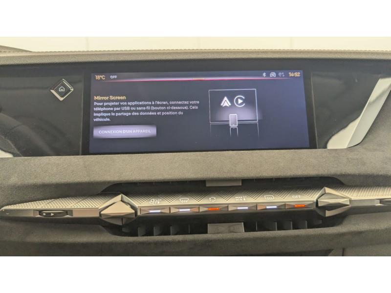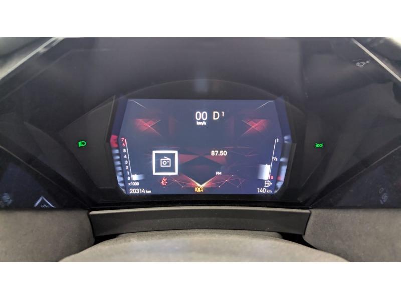 ABS avec répartiteur électronique de freinage (REF) et Aide au Freinage d'Urgence (AFU) + Aide au démarrage en penteAccès et démarrage mains libres ProximityAccoudoir central AR avec 2 porte-gobeletsAdaptive Cruise Control Stop&GoAide au stationnement AV/AR avec Caméra de reculAirbags frontaux (passager déconnectable), latéraux AV, rideaux aux places AV/AR et central entre les places AVAlerte Attention ConducteurAlerte de franchissement involontaire de ligneAllumage automatique des feuxAvertisseur de risque de collisionBanquette AR 2/3 - 1/3 avec 3 appuie-têteBoîte à gantsClimatisation automatique bi-zoneCombiné numérique 7"Condamnation automatique des portes et du coffre en roulantContrôle dynamique de stabilité (ESP) avec antipatinage des roues (ASR) + Contrôle de stabilité de l'attelageDétection de sous-gonflageDS EXTENDED HEAD UP DISPLAYDS IRIS SYSTEMDS MATRIX LED VISIONEclairage d'ambiance à LEDEclairage de boîte à gants, d'accoudoir central AV et de coffre à LEDEclairage de cave à pieds à LEDEcran tactile capacitif 10" HDEssuie-vitre AV à déclenchement et cadencement automatiques + Buses de lavageFeux AR Full LED effet 3D avec traitement écaillesFixations ISOFIX à la place passager AV et aux places latérales ARFrein de stationnement électrique automatiqueFreinage d'urgence automatique piloté par caméra et radarIntérieur Tissu Tressé Basalte avec Alcantara : Planche de bord en alcantara Panneaux de portes en alcantara Console centrale en alcantara Sellerie en Tissu Tressé Basalte avec Alcantara et toile DS Décors de panneaux de porte Chrome guilloché Volant en cuir fleurJantes alliage 19" MINNEAPOLISKit de dépannage provisoire de pneumatiquesLève-vitres AV/AR électriques, séquentiels et antipincementLunette AR chauffanteMirror Screen sans fil via Wifi Compatible Apple CarPlay et Android AutoPack Style : Pédalier en aluminium Vitres AR et lunette AR surteintéesPalettes au volantPare-brise teinté acoustiquePare-soleil avec miroirs de courtoisie occultables éclairés à LEDRétroviseur intérieur électrochrome sans cadreRétroviseurs extérieurs électriques, dégivrants, rabattables électriquement Avec éclairage d'accueilRadio numérique terrestre (DAB) Inclut le BluetoothReconnaissance étendue des panneaux de circulationReconnaissance des panneaux de vitesse et préconisationVitres AR et lunette AR surteintéesVolant réglable en hauteur et profondeur