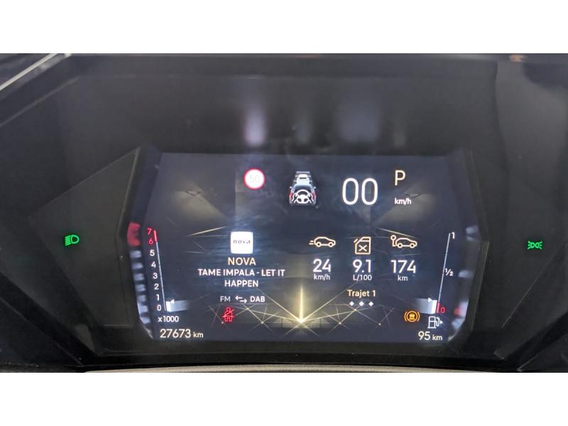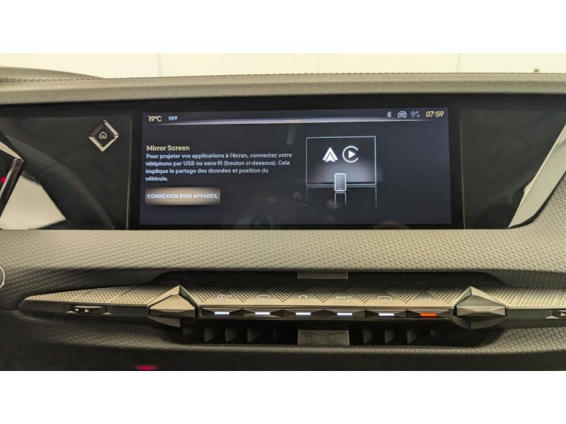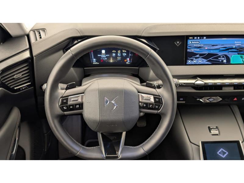 ABS avec répartiteur électronique de freinage (REF) et Aide au Freinage d'Urgence (AFU) + Aide au démarrage en penteAccès et démarrage mains libres ProximityAccoudoir central ARAccoudoir central AVAide au stationnement AV et AR et Caméra de reculAirbags frontaux (passager déconnectable), latéraux AV, rideaux aux places AV/AR et central entre les places AVAlerte de franchissement involontaire de ligneAllumage automatique des feuxBanquette AR 2/3 - 1/3 avec 3 appuie-têteClean Cabin avec Air Quality SystemClimatisation automatique bi-zoneCombiné numérique 7"Commutation automatique des feuxCondamnation automatique des portes et du coffre en roulantContrôle dynamique de stabilité (ESP) avec antipatinage des roues (ASR) + Contrôle de stabilité de l'attelageDétection de sous-gonflageDS Drive Assist et Pack Détection Trafic AR : Adaptive Cruise Control Stop & Go Surveillance d'angles morts longue distance Alerte de Trafic AR Lane Positioning Assist afin de gérer la conduite de manière semi-autonomeDS e-toggle (Sélecteur de vitesses)DS EXTENDED HEAD UP DISPLAY Affichage tete haute étenduDS IRIS SYSTEMDS MATRIX LED VISIONEclairage d'ambiance à LEDEclairage de boîte à gants, d'accoudoir central AV et de coffre à LEDEclairage de cave à pieds à LEDEcran tactile capacitif 10" HDEssuie-vitre AV à déclenchement et cadencement automatiques + Buses de lavageFeux AR Full LED effet 3D avec traitement écaillesFixations ISOFIX à la place passager AV et aux places latérales ARFrein de stationnement électrique automatiqueFreinage d'urgence automatique piloté par caméra et radarIntérieur Cuir grainé Noir Basalte et Toile DS : Ciel de pavillon clair Décors de panneaux de porte Chrome guilloché Volant en cuir fleur Mistral Console centrale en Toile DS Mistral Planche de bord en toile DS Noir Basalte façon écaille Panneaux de portes Jantes alliage 19" SEVILLAKit de dépannage provisoire de pneumatiquesLève-vitres AV/AR électriques, séquentiels et antipincementLunette AR chauffanteMirror Screen sans fil via Wifi Compatible Apple CarPlay et Android AutoPack Sièges mécaniques avec réglages lombaires conducteur et passagerPalettes au volantPare-brise teinté acoustiquePare-soleil avec miroirs de courtoisie occultables éclairés à LEDRétroviseur intérieur électrochrome sans cadreRétroviseurs extérieurs électriques, dégivrants, rabattables électriquement Avec éclairage d'accueilRadio numérique terrestre (DAB) Inclut le BluetoothReconnaissance des panneaux de vitesse et préconisationSOSVitres AR et lunette AR surteintéesVolant réglable en hauteur et profondeur