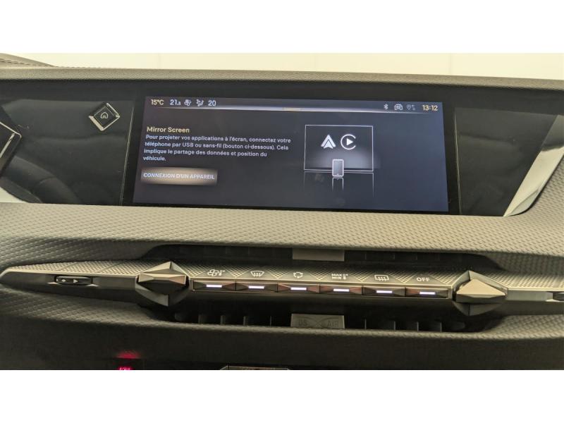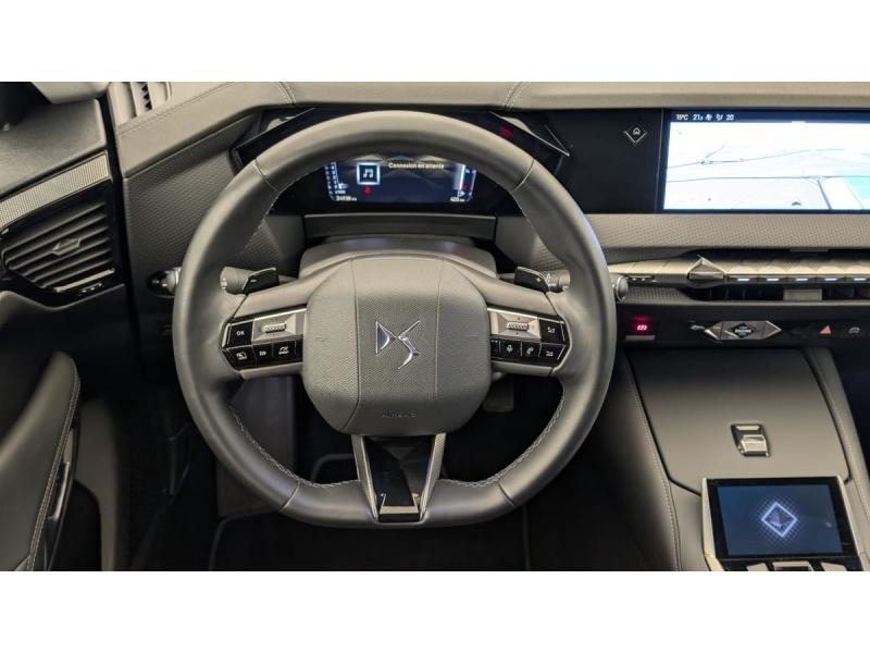 ABS avec répartiteur électronique de freinage (REF) et Aide au Freinage d'Urgence (AFU) + Aide au démarrage en penteAccès et démarrage mains libres ProximityAccoudoir central ARAide au stationnement AV et AR et Caméra de reculAirbags frontaux (passager déconnectable), latéraux AV, rideaux aux places AV/AR et central entre les places AVAllumage automatique des feuxAntenne "aileron de requin"Avertisseur de risque de collisionBanquette AR 2/3 - 1/3 avec 3 appuie-têteClimatisation automatique bi-zoneCombiné numérique 7"Commutation automatique des feuxCondamnation automatique des portes et du coffre en roulantConsole centrale avec rangement ferméContrôle dynamique de stabilité (ESP) avec antipatinage des roues (ASR) + Contrôle de stabilité de l'attelageDétection de sous-gonflageDS Drive Assist et Pack Détection Trafic AR : Surveillance d'angles morts longue distance Alerte de Trafic ARDS e-toggle (Sélecteur de vitesses)DS EXTENDED HEAD UP DISPLAY Affichage tete haute étenduDS IRIS SYSTEMDS MATRIX LED VISIONEclairage d'ambiance à LEDEclairage de boîte à gants, d'accoudoir central AV et de coffre à LEDEclairage de cave à pieds à LEDEcran tactile capacitif 10" HDEssuie-vitre AV à déclenchement et cadencement automatiques + Buses de lavageFeux AR Full LED effet 3D avec traitement écaillesFixations ISOFIX à la place passager AV et aux places latérales ARFrein de stationnement électrique automatiqueFreinage d'urgence automatique piloté par caméra et radarIntérieur Cuir grainé Noir Basalte et Toile DS : Ciel de pavillon clair Décors de panneaux de porte Chrome guilloché Volant en cuir fleur Mistral Console centrale en Toile DS Mistral Planche de bord en toile DS Noir Basalte façon écaille Panneaux de portes Jantes alliage 19" SEVILLAKit de dépannage provisoire de pneumatiquesLève-vitres AV/AR électriques, séquentiels et antipincementLunette AR chauffanteMirror Screen sans fil via Wifi Compatible Apple CarPlay et Android AutoPack Sièges mécaniques avec réglages lombaires conducteur et passagerPalettes au volantPare-brise teinté acoustiquePare-soleil avec miroirs de courtoisie occultables éclairés à LEDRégulateur/Limiteur de vitesseRétroviseur intérieur électrochrome sans cadreRétroviseurs extérieurs électriques, dégivrants, rabattables électriquement Avec éclairage d'accueilRadio numérique terrestre (DAB) Inclut le BluetoothReconnaissance des panneaux de vitesse et préconisationSOSVitres AR et lunette AR surteintéesVolant réglable en hauteur et profondeur