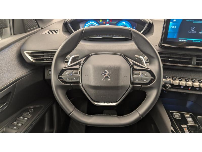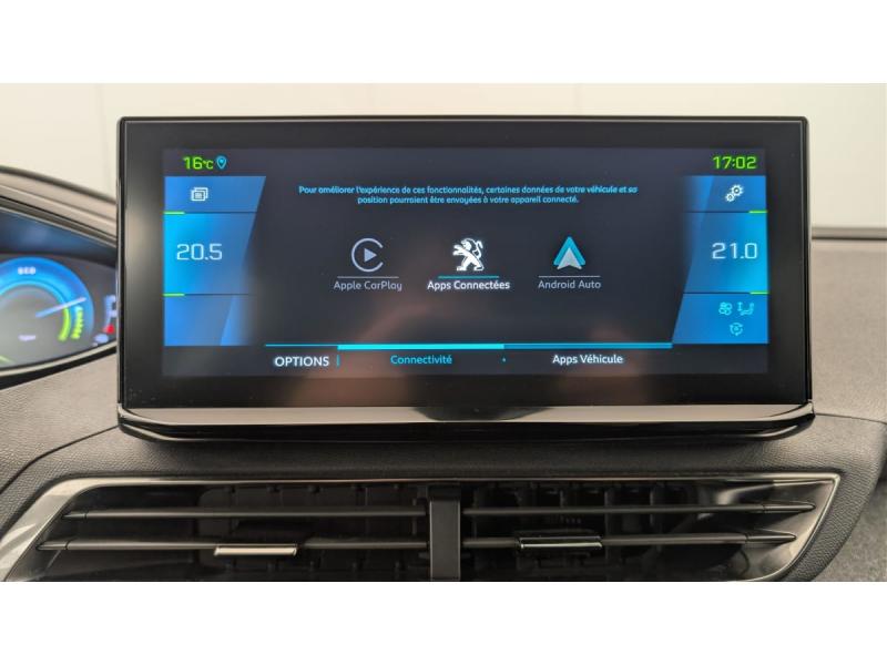 6 airbags (Frontaux adaptatifs, latéraux AV, rideaux AV/AR)Accès et démarrage mains libresAccoudoir central AV à ouverture papillon, avec compartiment de rangement éclairé et réfrigérableAir conditionné automatique bi-zone avec aérateurs aux places ARAppuis-tête à sécurité optimisée réglables en hauteur (conducteur, passager et AR x3)Avertisseur de temps de conduiteAvertisseur sonore audible depuis l'extérieur pour la sécurité piétonsBanquette AR rabattable 1/3 - 2/3 avec accoudoir central, trappe à skis et commandes de rabattement depuis le coffreCâble de recharge T2 mode 2 (10 A / 2,3 kW)Calandre á damiers chromésChargeur embarqué 3,7kWCoques de rétroviseurs extérieurs Noir Perla NeraDécors de planche de bord et panneaux de portes en maille "Brumeo"Détection de sous-gonflage indirecteDirection assistée électrique, colonne de direction réglable en hauteur et profondeur (mécanique)Enjoliveur d'arc de pavillon en Inox BrillantEnjoliveurs d'ailes AV chromésEssuie-vitre AV avec système de lavage "Magic Wash"Fixations ISOFIX (passager AV et aux places latérales AR)Fonction "Mirror Screen" (Apple CarPlay / Android Auto )Frein de stationnement électrique avec aide au démarrage en pente et serrage automatiqueGarnissage TEP avec Tissu Colyn MistralIndicateur de rapport conseilléJantes alliage 18" diamantées DETROIT bi-ton Gris Storm brillant avec pneumatiques 225/55 R18 102 VKit de dépannage de pneumatique : compresseur 12 volts, flacon de produit de colmatage, anneau de remorquage, deux cales de roue, manivelle de frein de stationnement électriqueLève-vitres AV/AR électriques et séquentiels avec antipincementNavigation 3D connectée avec écran tactile capacitif 10" HD Avec reconnaissance vocale, cartographie EuropePack City 1 : Aide graphique et sonore au stationnement AV Aide graphique et sonore au stationnement AR Visiopark 1 : caméra de recul avec restitution sur l'écran tactile d'une vue AR et d'une vue de dessus de l'environnement AR du véhiculePack Safety Plus : Alerte Risque de Collision (Distance Alert) Alerte attention conducteur Commutation automatique des feux de route / feux de croisement Alerte active de franchissement involontaire de ligne et bas côté Freinage d'urgence automatique avec caméra & radarPack Visibilité : Eclairage d'accompagnement automatique Allumage automatique des feux de croisement Essuie-vitre AV à déclenchement automatiquePares-soleil avec miroirs de courtoisie éclairésPassages de roues rapportés Noir MatPEUGEOT Connect SOS & AssistancePeugeot i-Cockpit avec combiné tête haute numérique, volant compact multi-fonctionsPlafonniers AV/AR à LED avec 2 spots de lecturePlancher de coffre fixe avec articulation pour accès au coffre de rangement du câble de rechargePoches/filets aumonières au dos des sièges AVPrise 12 V (x3 : zone connectique, AR de console et coffre)Projecteurs "Peugeot LED Technology" avec feux diurnes à LED sous projecteursRégulateur / Limiteur de vitesseRétroviseur intérieur photosensibleRétroviseurs extérieurs dégivrants avec réglage et rabattement électriques, éclairage d'accueil à LED, témoin de surveillance d'angles mortsReconnaissance étendue des panneaux de signalisationSécurité enfants électrique des vitres ARSélecteur de modes de conduite (Electric, Hybrid, Sport)Sabot de pare-chocs AV peint MétallureSiège conducteur avec réglage lombaireSièges AV réglables en hauteurToggle Switches chromés (touches piano d'activation des fonctions de l'écran tactile)Trappe de recharge électrique avec indicateur d'état de chargeVitres latérales AR et lunette AR chauffante surteintéesVolant Cuir fleur Mistral