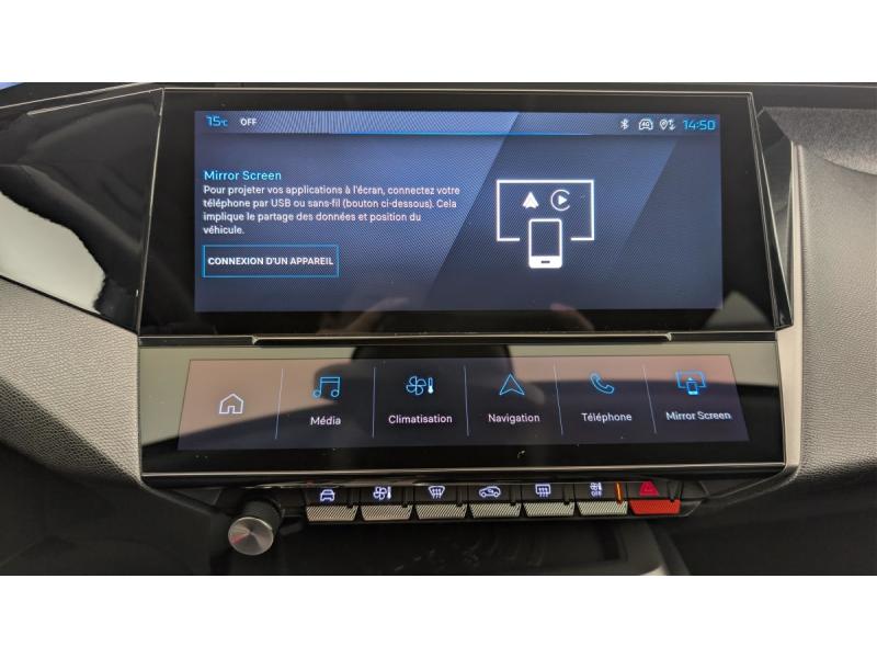 2 prises USB-C à l'AR2 prises USB-C à l'AV2 télécommandes 3 boutons4 poignées de maintienAccès et démarrage mains libresAccoudoir central avec rangement et porte gobeletActive Safety Brake piloté par caméra et radarAide au stationnement ARAir conditionné automatique bi-zoneAirbags frontaux conducteur et passager adaptatifs (passager neutralisable par clé), airbags latéraux conducteur et passager AV.airbags rideaux de tête aux places AV/ARBanquette AR rabattable 2/3-1/3Calandre avec grille chroméeCommutation automatique des feux de routeCoques de rétroviseurs extérieurs Noir BrillantDécors intérieurs textiles (planche de bord, panneaux de porte)Détection de sous gonflageDirection assistée électriqueESP avec fonction Hill Assist (Aide au démarrage en pente)Essuie-vitre AV à déclenchement automatiqueFeux diurnes à LED sous projecteursFixations ISOFIX aux 2 places latérales AR (Top Tether)Fonction BluetoothFonction DAB (Radio Numérique Terrestre)Fonction Mirror Screen (Apple CarPlay / Android Auto ) sans filFrein de stationnement électriqueJantes alliage 17" SilexLécheurs de vitres Noir BrillantLève-vitres AV/AR électriques et séquentiels avec antipincementNavigation connectée avec écran central tactile 10'' et i-Toggles virtuels personnalisablesPack Drive Assist - Régulateur de vitesse adaptatif avec fonction Stop&Go : Régulateur de vitesse adaptatif avec fonction Stop&GoPack Safety Plus - Freinage d'urgence automatique (Active Safety Brake ) avec alerte risque de collision - Freinage d'urgence automatique de jour et de nuit (caméra & radar) - Alerte active de franchissement involontaire de ligne et bas côté - Reconnaissance &Pare-brise teinté feuilleté acoustiquePeugeot i-Cockpit avec instrumentation numérique 10" personnalisablePrise 12 V à l'AVProjecteurs Peugeot LED TechnologyRéglage lombaire du siège conducteurRétroviseurs extérieurs électriques, dégivrants et rabattables électriquement, avec répétiteurs de feux clignotants à LEDReconnaissance vocale en langage naturelSélecteur mode de conduite Eco et SportSièges AV réglables en hauteurSièges dynamiques avec appuis tête AV deux voiesSystème audio 6 HPSystème stop & go couplé avec l'assistance au positionnement sur la voieVisioPark 1 (caméra de recul)Vitres latérales AR et lunette AR chauffante temporisée surteintéesVolant avec réglage manuel en hauteur et en profondeurVolant croûte de cuir