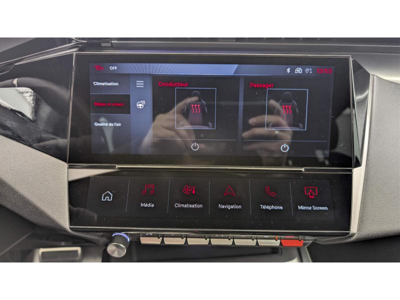 Accès et démarrage mains libresAccoudoir central avec rangement et porte gobeletAide au stationnement ARAide au stationnement AVAir conditionné automatique bi-zoneAirbags frontaux conducteur et passager adaptatifs (passager neutralisable par clé), airbags latéraux conducteur et passager AV.airbags rideaux de tête aux places AV/ARBanquette AR rabattable 2/3-1/3Commutation automatique des feux de routeDétection de sous gonflageDirection assistée électriqueESP avec fonction Hill Assist (Aide au démarrage en pente)Essuie-vitre AV à déclenchement automatiqueFeux AR spécifiques avec allumage dynamique griffe à griffeFeux diurnes à LED sous projecteursFixations ISOFIX aux 2 places latérales AR (Top Tether)Fonction BluetoothFonction DAB (Radio Numérique Terrestre)Fonction Mirror Screen (Apple CarPlay / Android Auto ) sans filFrein de stationnement électriqueJantes alliage 19" diamantées GRAPHITELève-vitres AV/AR électriques et séquentiels avec antipincementNavigation connectée avec écran central tactile 10'' et i-Toggles virtuels personnalisablesPédalier Sport et repose pied en aluminiumPack Drive Assist Plus : Régulateur de vitesse adaptatif avec fonction Stop&Go Conduite semi-autonome (niveau 2) Aide au maintien de la position dans la voiePack Safety Plus : Alerte attention conducteur Reconnaissance étendue des panneaux de signalisation et préconisation de vitesse Alerte active de franchissement involontaire de ligne et bas côté Freinage d'urgence automatique de jour et de nuit (caméra & raPare-brise teinté feuilleté acoustiquePeugeot Connect SOSPeugeot i-Cockpit avec instrumentation numérique 10" personnalisableProjecteurs Peugeot Matrix LED Technology Éclairage adaptatif en fonction des conditions extérieures et de la circulationRéglage lombaire du siège conducteurRétroviseur intérieur photosensibleRétroviseurs extérieurs électriques, dégivrants et rabattables électriquement, avec répétiteurs de feux clignotants à LEDSélecteur mode de conduite Eco et SportSeuils de portes AV aluminiumSièges AV réglables en hauteurSystème audio 6 HPVitres AV feuilletées acoustiquesVitres latérales AR et lunette AR chauffante temporisée surteintéesVolant chauffantVolant cuir perforéVolet motorisé avec accès bras chargés