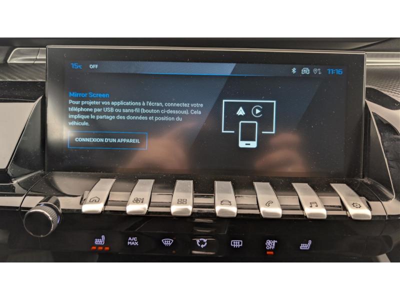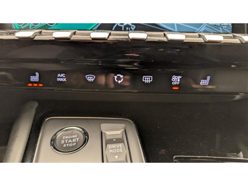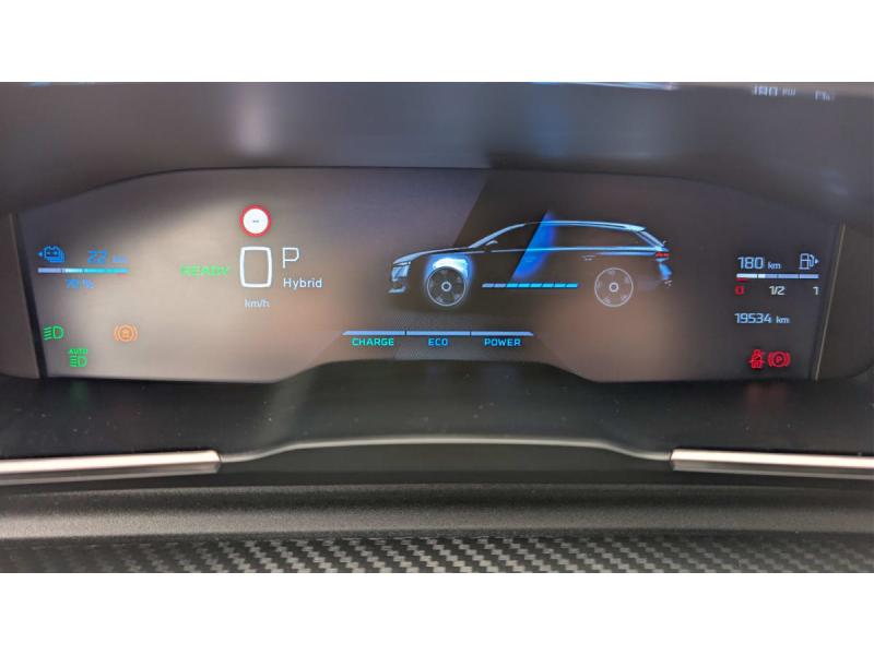 6 airbags (Frontaux adaptatifs, latéraux AV, rideaux AV/AR)Accès et démarrage mains libresAccoudoir central AV en TEP à ouverture papillonAide au stationnement AR, AV et latérale (graphique et sonore)Air conditionné automatique bi-zoneAppuis-tête à sécurité optimisée réglables en hauteur (conducteur, passager et AR x3)AVAS (système d'alerte sonore du véhicule émis à faible allure en roulage électrique, audible depuis l'extérieur pour la sécurité des piétons)Avertisseur de temps de conduiteBanquette AR rabattable 1/3 - 2/3 avec accoudoir central, trappe à skis et commandes de rabattement depuis le coffreBarres de toit longitudinales Noir BrillantCâble de recharge T2 mode 2 (10 A / 2,3 kW)Coques et embases de rétroviseurs extérieurs Noir brillantDétection de sous-gonflage indirecteDirection assistée électrique, réglable en hauteur et profondeur (mécanique)Eclairage intérieur LED : Plafonniers AV et AR avec 2 spots de lecture, Pare soleil avec miroirs de courtoisie éclairés, rangements, caves à piedsFeux arrière Full LED avec indicateurs de direction défilantsFixations ISOFIX aux places latérales ARFonction DAB (Radio Numérique Terrestre)Fonction Mirror Screen (Apple CarPlay / Android Auto ) sans filFrein de stationnement électriqueJantes alliage 17" Merion bi-ton diamanteesKit de dépannage de pneumatiquePack Safety Plus : Freinage d'urgence automatique avec caméra & radar Système de surveillance d'angle mort Reconnaissance étendue des panneaux de signalisation Alerte risque de collision et Alerte attention conducteur Alerte de franchissement involontaire de lignePack Visibilité : Eclairage d'accompagnement automatique Allumage automatique des feux de croisement Essuie-vitre AV à déclenchement automatiquePeugeot Connect SOSPeugeot i-Cockpit avec combiné numérique tête haute 12,3"Peugeot i-Connect Advanced - Navigation 3D connectée (cartographie Europe) avec écran tactile 10" HD - Reconnaissance vocale en langage naturelProgramme de Stabilité Electronique (ESC) Avec antipatinage des roues (ASR), antiblocage des roues (ABS), répartiteur électronique de freinage (REF), assistance au freinage d'urgence (AFU), contrôle dynamique de stabilité (CDS) et contrôle de stabilit&eacProjecteurs Peugeot Matrix LED Technology Eclairage adaptatif avec correction automatique de site, 3 modes (Routes, Autoroutes et Brouillard) et feux diurnes 3 griffes à LED intégrés aux projecteursRégulateur / limiteur de vitesse avec Préconisation Limitation de VitesseRétroviseur intérieur électrochromeRétroviseurs extérieurs électriques et dégivrants, rabattables électriquement avec éclairage d'accueil à LED, témoins de surveillance d'angles mortsSélecteur de boite de vitesses automatique e-ToggleSélecteur de modes de conduite 'Drive Mode' (Electric, Hybrid, Sport)Sellerie mi-TEP / Tissu Falgo avec surpiqures QuartzSièges conducteur et passager réglables en hauteur, avec réglage lombaire électrique (4 voies)Toggle Switches' chromés (touches 'piano' d'activation des fonctions de l'écran tactile)VisioPark 1 Caméra de recul Haute Définition 180° avec restitution sur l'écran tactile d’une vue AR et d'une vue de dessus de l'environnement AR du véhiculeVitres latérales AR et lunette AR surteintéesVolant cuir fleur avec commandes intégrées